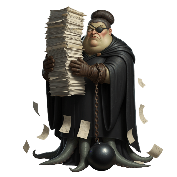 He walks with an endless folder in his hand; every step brings a new form, and every brilliant idea gets trapped in a sea of reviews and committees. He feeds his power with the wasted time of others.