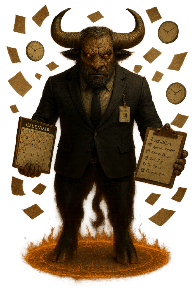 The Meeting Minotaur traps teams in endless labyrinths of unproductive meetings. His maze-like labyrinthine schedule wastes hours without clear direction or outcome. No one remembers why they entered, but everyone knows they’ll leave exhausted, with nothing achieved. He thrives on bringing everyone into his world of endless discussions and circular conversations, ensuring the team’s energy is drained by the time they escape.