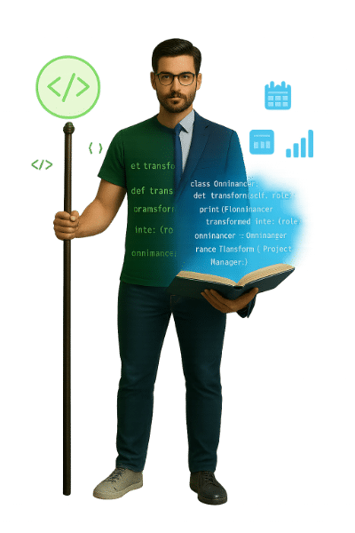 Omnimancer is a being with the ability to transform and adapt to any role needed in a project. Whether as a Project Manager, Delivery Lead, developer, or tester, his magic makes him indispensable in any situation. With his versatility, he is never limited to one function; he can lead, create, coordinate, and deliver with equal ease. However, his ability to take on multiple roles often pushes him to the limit, but he always finds a way to keep the project on track and bring it to a successful conclusion.